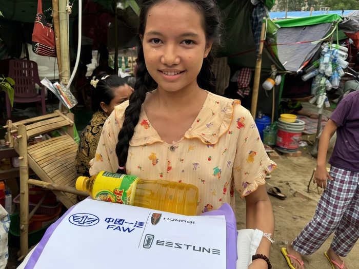 2025年4月初,緬甸7.9級地震發(fā)生后,中國一汽與緬甸合作伙伴第一時間啟動救災(zāi)援助工作,聯(lián)動中國鄉(xiāng)村發(fā)展基金會開展救援物資采購與運輸,捐贈帳篷、發(fā)電機、防雨布及蚊帳、糧油包等救援物資,并完成兩個臨時安置社區(qū)的帳篷搭建,有效保障了安置點基本運轉(zhuǎn)。災(zāi)難面前,胞波同行,安置社區(qū)民眾對來自中國的及時援助表示熱烈歡迎與誠摯感謝。