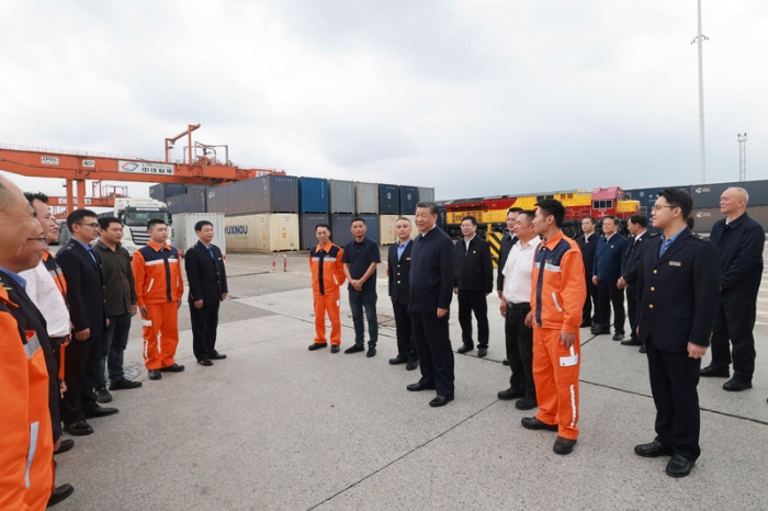 4月22日至24日,中共中央總書記、國家主席、中央軍委主席習(xí)近平在重慶考察。這是22日下午,習(xí)近平在重慶國際物流樞紐園區(qū)重慶鐵路集裝箱中心站,同貨車司機(jī)、列車司機(jī)、裝卸工人、場站管理人員等親切交流。