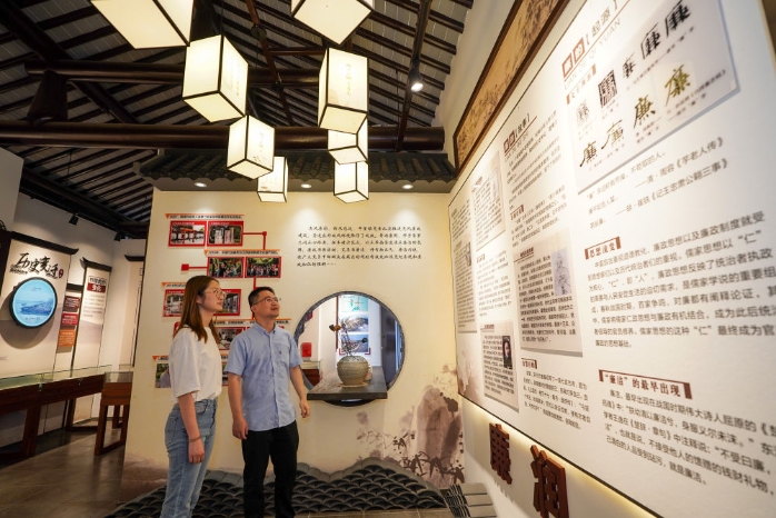 參觀者在蘇州市吳江區(qū)平望鎮(zhèn)廉潔教育基地鶯湖廉園內參觀(2024年7月4日攝)。新華社記者 李博 攝
