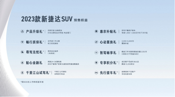 2023款新捷達(dá)SUV正式開啟預(yù)售,2023款新捷達(dá)VS7預(yù)售價格為10.59萬-13.79萬元,2023款新捷達(dá)VS5預(yù)售價格為8.69萬-11.79萬元,以親民價格和升級配置帶來極具性價比的實力之選。預(yù)售期間,捷達(dá)品牌將推出500臺上市特別版車型,預(yù)定客戶可享產(chǎn)品升級禮、暢行質(zhì)保禮等10重預(yù)售好禮,助力購車無憂。
