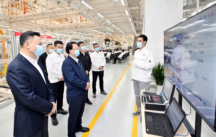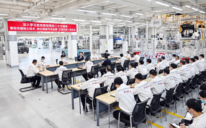 在紅旗長青工廠總裝車間,景俊海向一線職工代表宣講黨的二十大精神。景俊海指出,黨的二十大對全面建設(shè)社會主義現(xiàn)代化國家、全面推進中華民族偉大復(fù)興進行了戰(zhàn)略謀劃,為新時代黨和國家事業(yè)發(fā)展、實現(xiàn)第二個百年奮斗目標指明了前進方向、提供了根本遵循。黨的二十屆一中全會產(chǎn)生了新一屆中央領(lǐng)導(dǎo)機構(gòu),習(xí)近平同志繼續(xù)擔(dān)任中共中央總書記、中央軍委主席,充分體現(xiàn)了全黨全軍全國各族人民的共同意志和心聲期盼。面對世界百年未有之大變局,有習(xí)近平總書記作為黨的核心、人民領(lǐng)袖、軍隊統(tǒng)帥掌舵領(lǐng)航,是黨之大幸、國之大幸、民之大幸。我們一定要深刻領(lǐng)悟“兩個確立”的決定性意義,增強“四個意識”、堅定“四個自信”、做到“兩個維護”,緊跟習(xí)近平總書記走好新的趕考之路、奪取新的偉大勝利。景俊海強調(diào),黨的二十大報告對發(fā)展制造業(yè)提出了一系列新目標、新要求、新舉措,為汽車產(chǎn)業(yè)發(fā)展提供了廣闊空間。希望一汽搶抓機遇、乘勢而上,緊跟汽車產(chǎn)業(yè)發(fā)展電動化、智能化、網(wǎng)聯(lián)化、共享化趨勢,以高水平科技自立自強驅(qū)動企業(yè)高質(zhì)量發(fā)展。